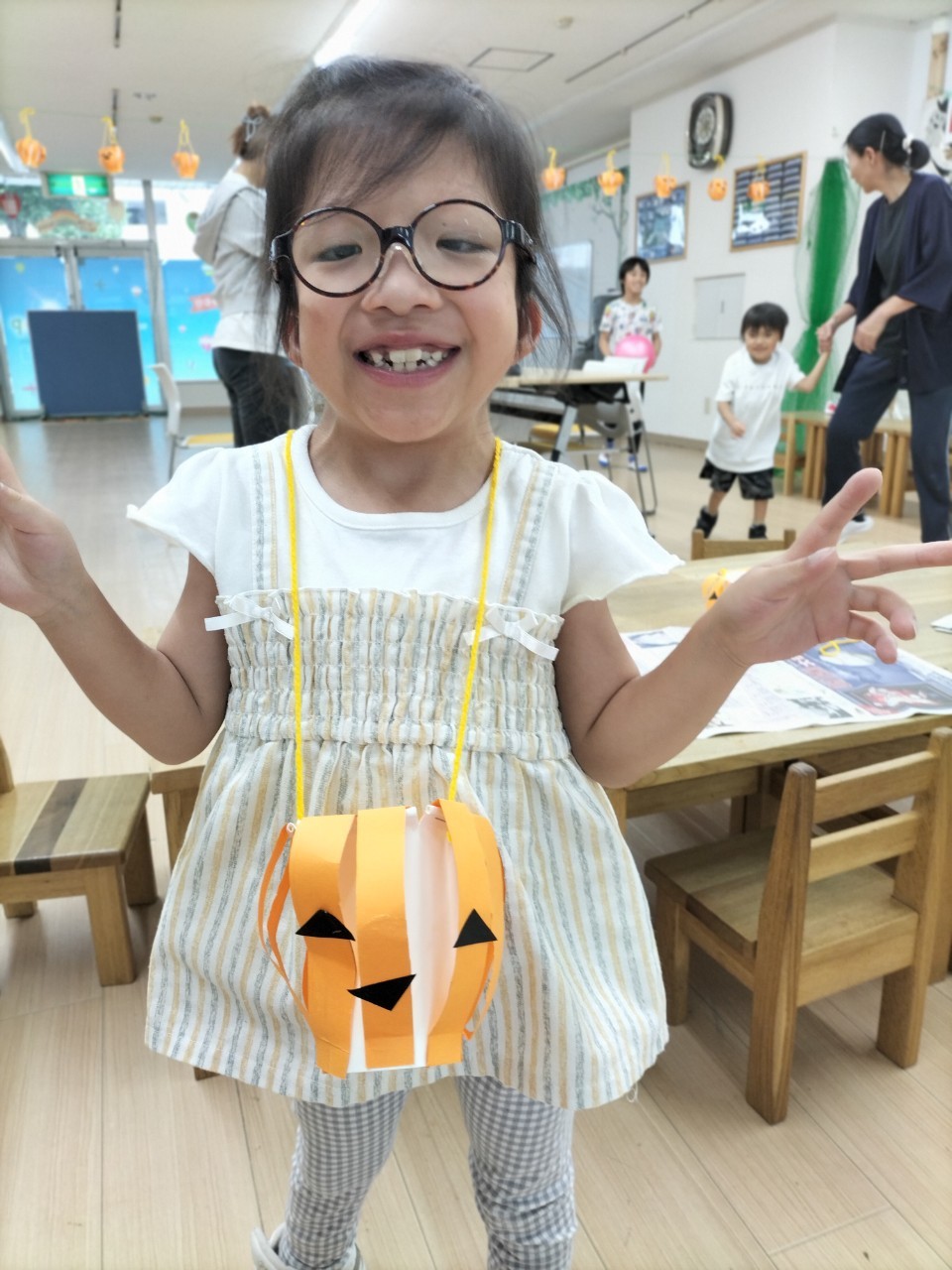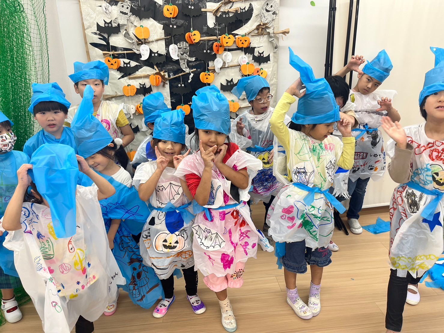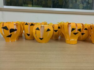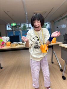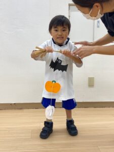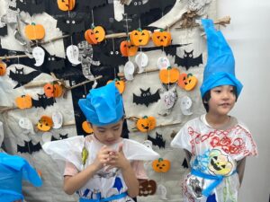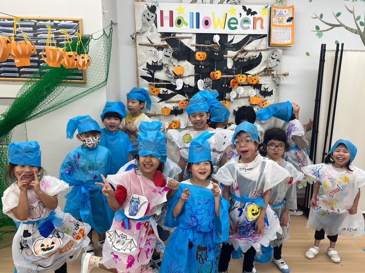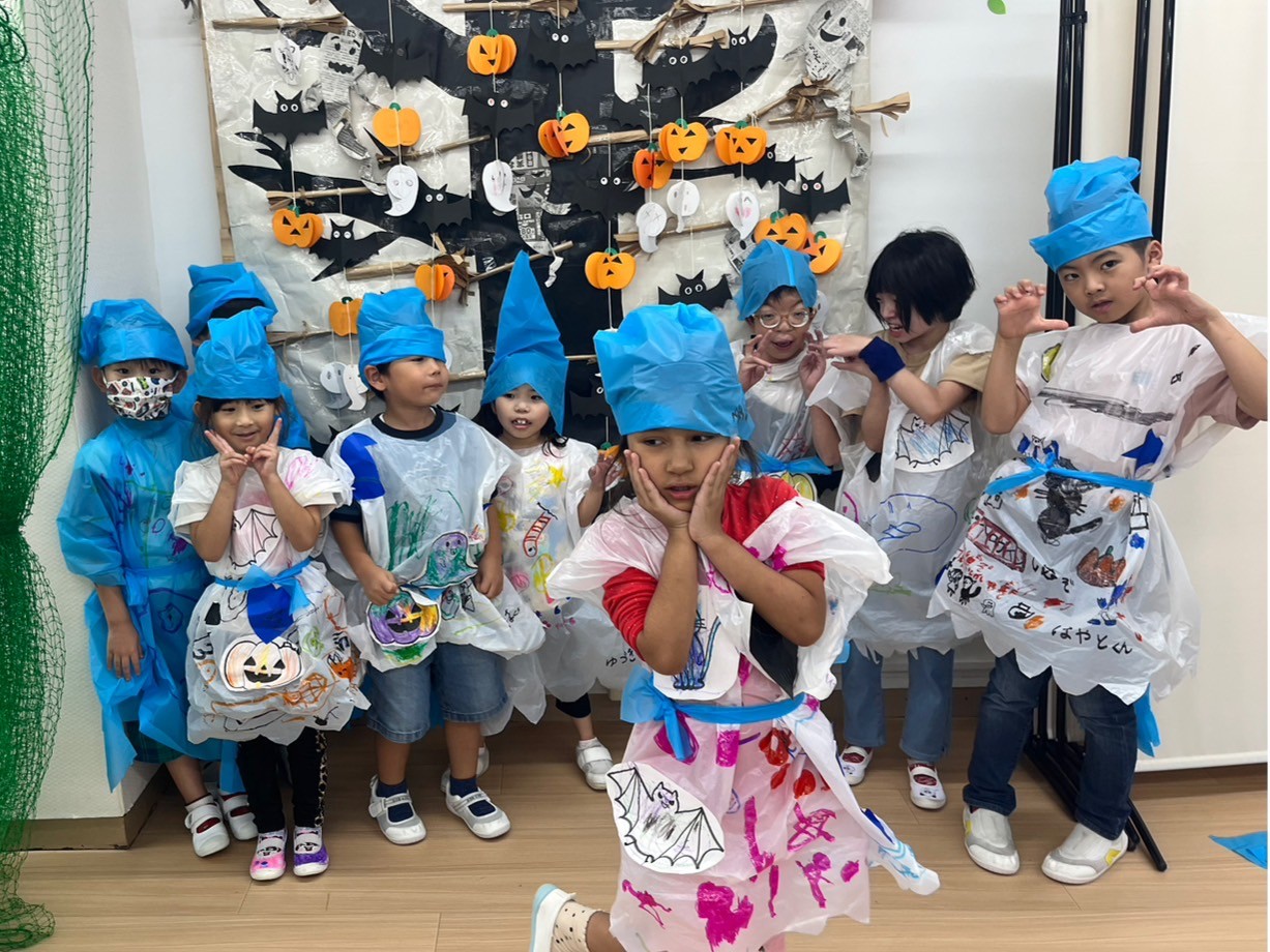 また10月がハロウィン🎃月❗と認識してもらうための方法として、10月の活動でかぼちゃ🎃のお菓子入れを作る工作活動。また、それぞれの創造性と感性を生かした衣装作り活動と全身を使って踊ったハロウィンダンス🎃