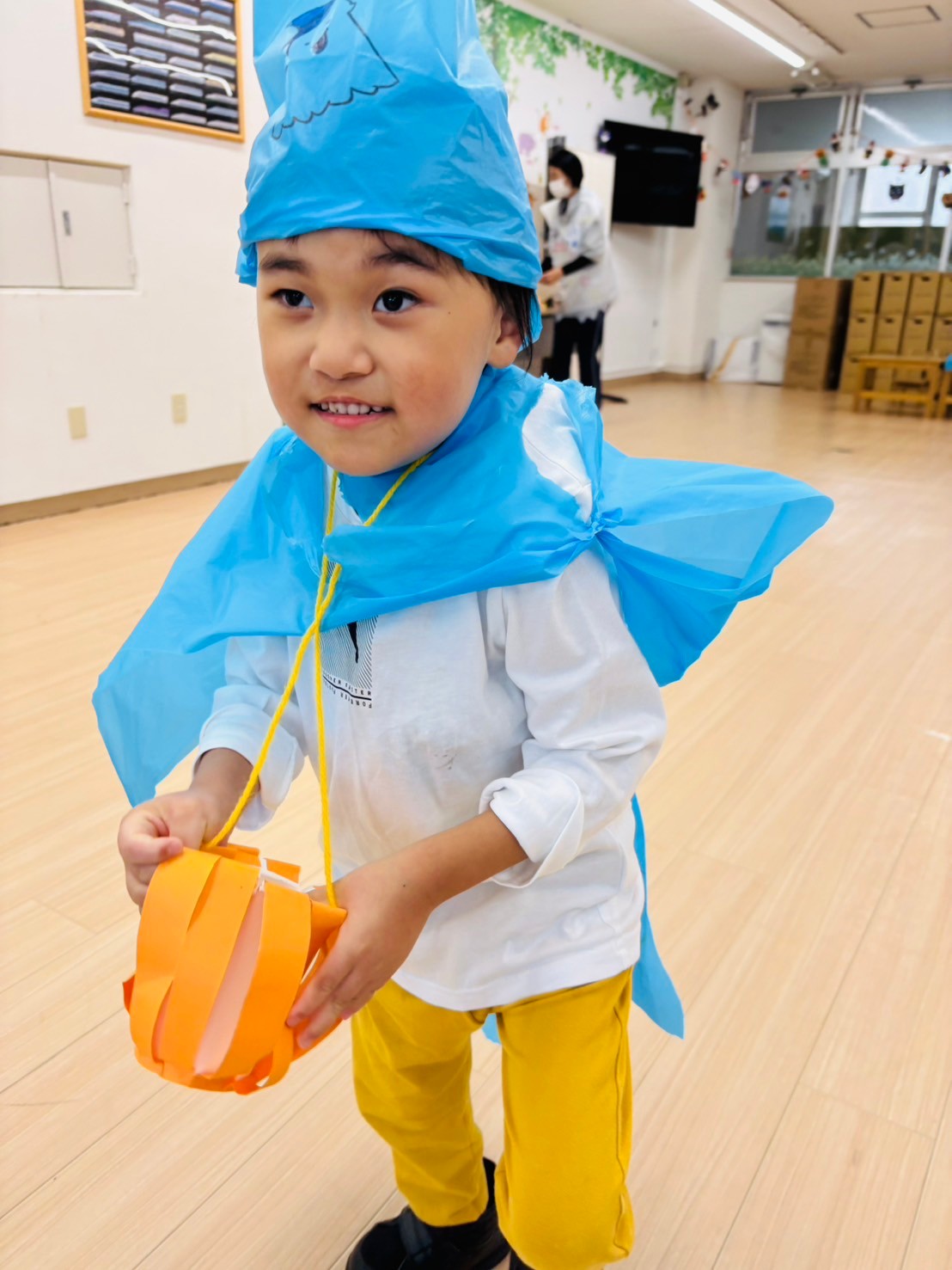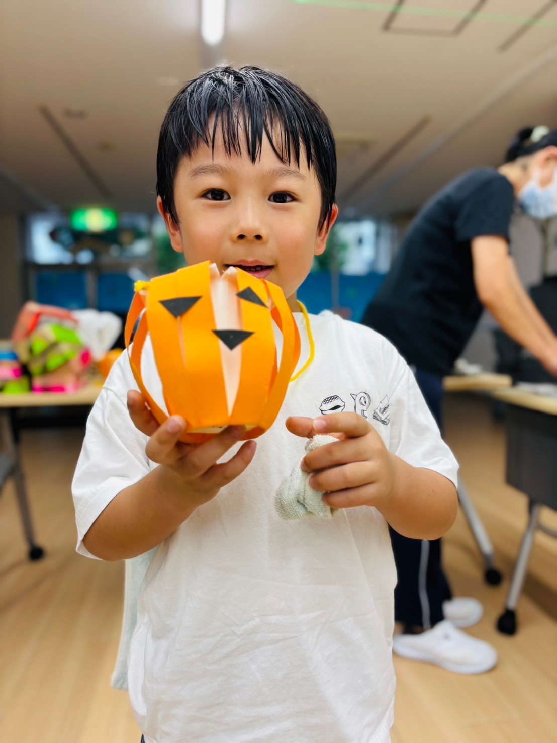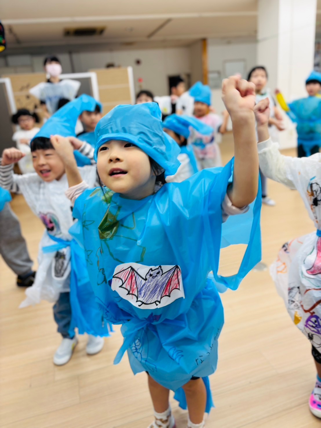 また10月がハロウィン🎃月❗と認識してもらうための方法として、10月の活動でかぼちゃ🎃のお菓子入れを作る工作活動。また、それぞれの創造性と感性を生かした衣装作り活動と全身を使って踊ったハロウィンダンス🎃