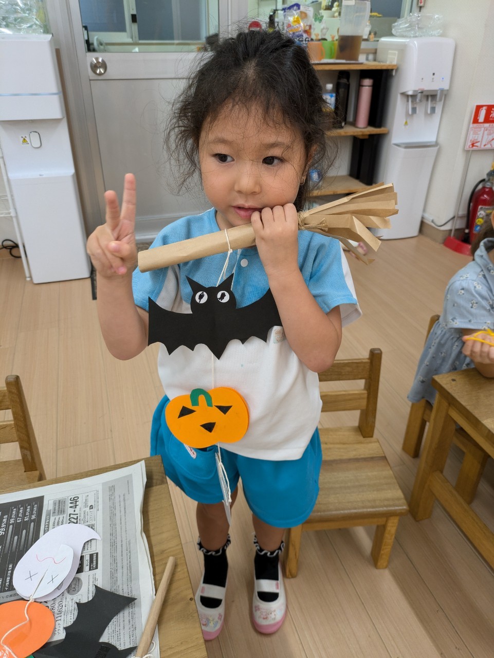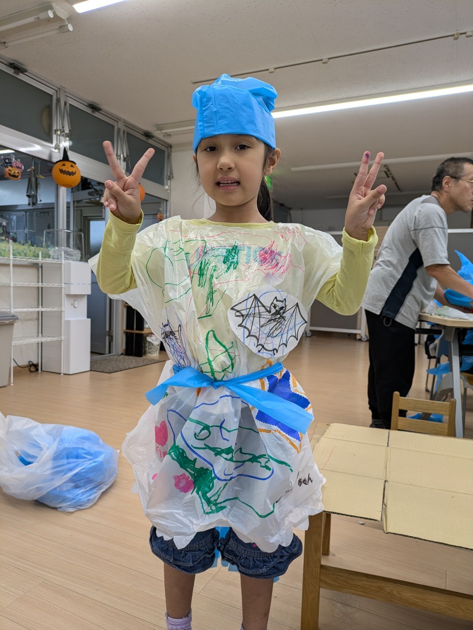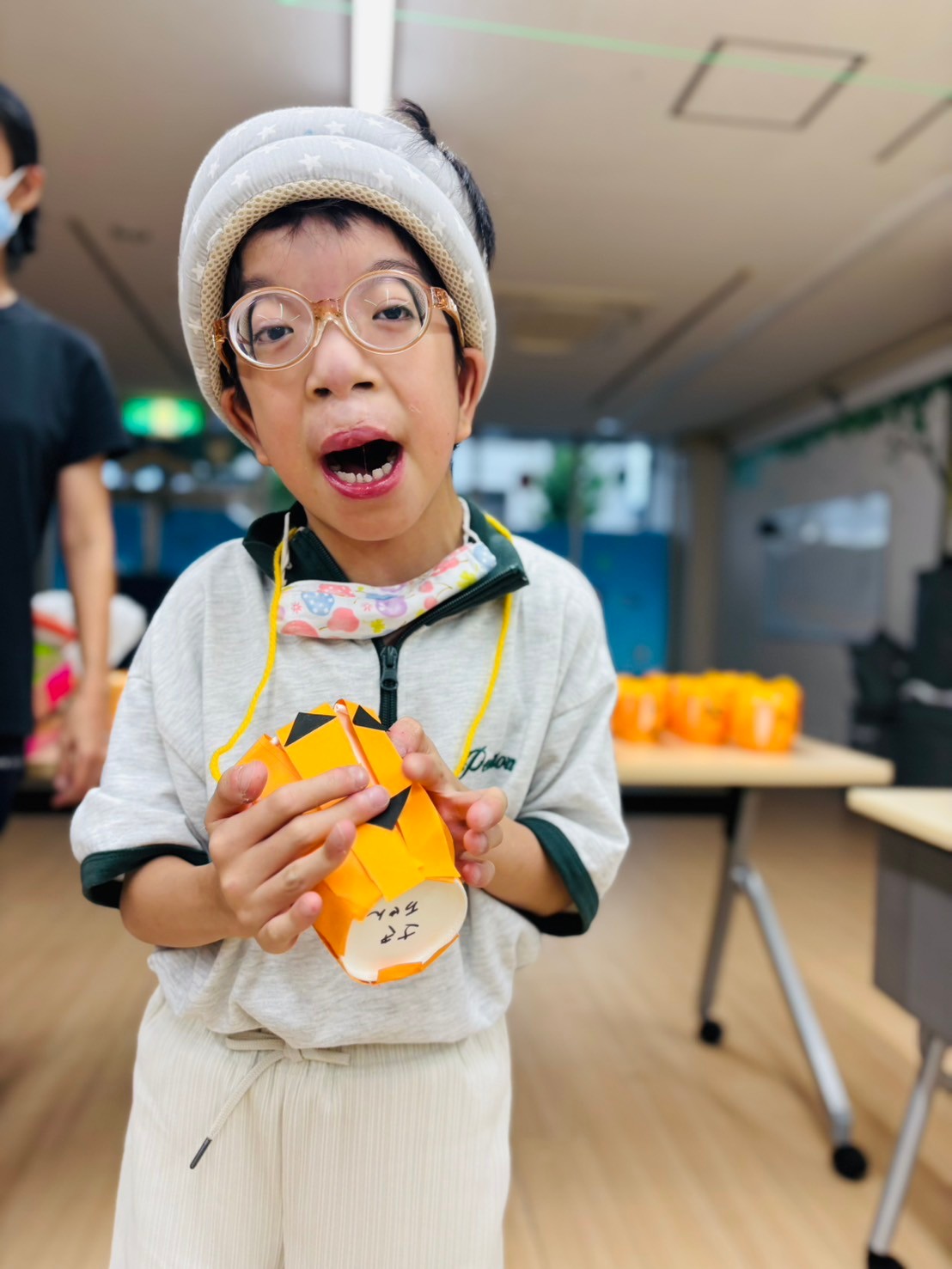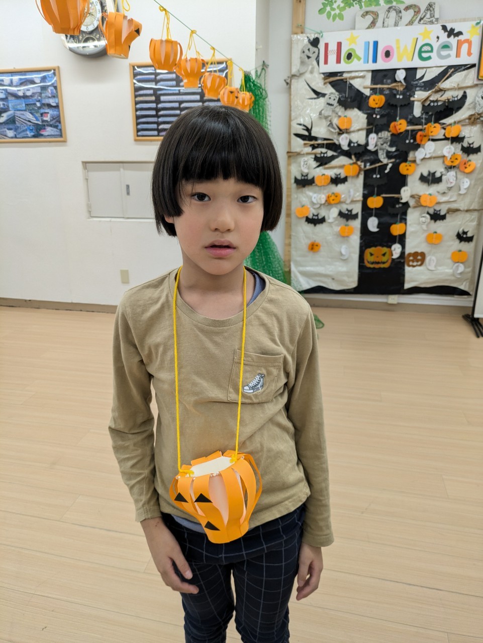 また10月がハロウィン🎃月❗と認識してもらうための方法として、10月の活動でかぼちゃ🎃のお菓子入れを作る工作活動。また、それぞれの創造性と感性を生かした衣装作り活動と全身を使って踊ったハロウィンダンス🎃