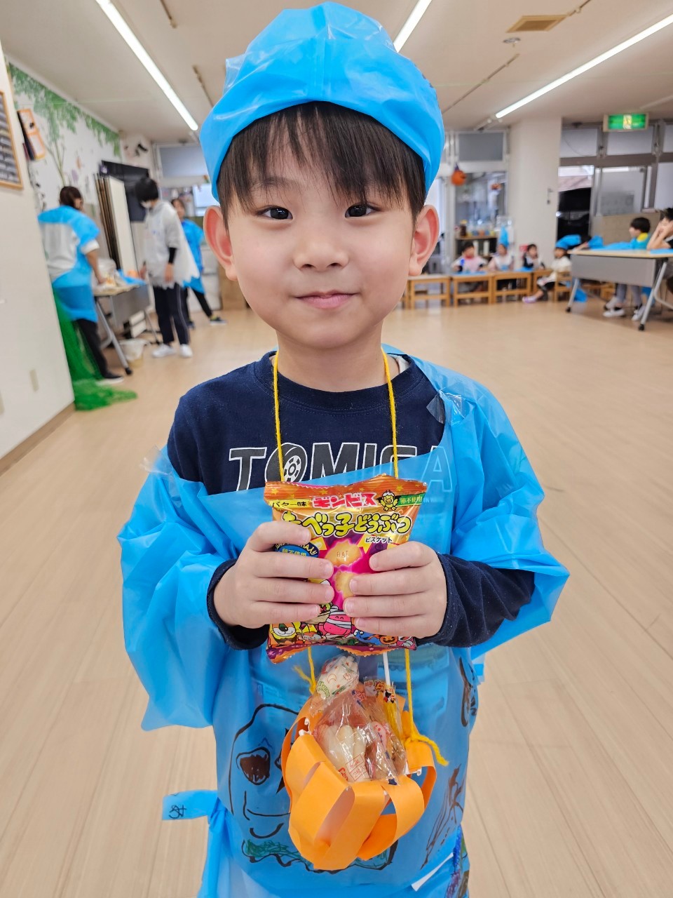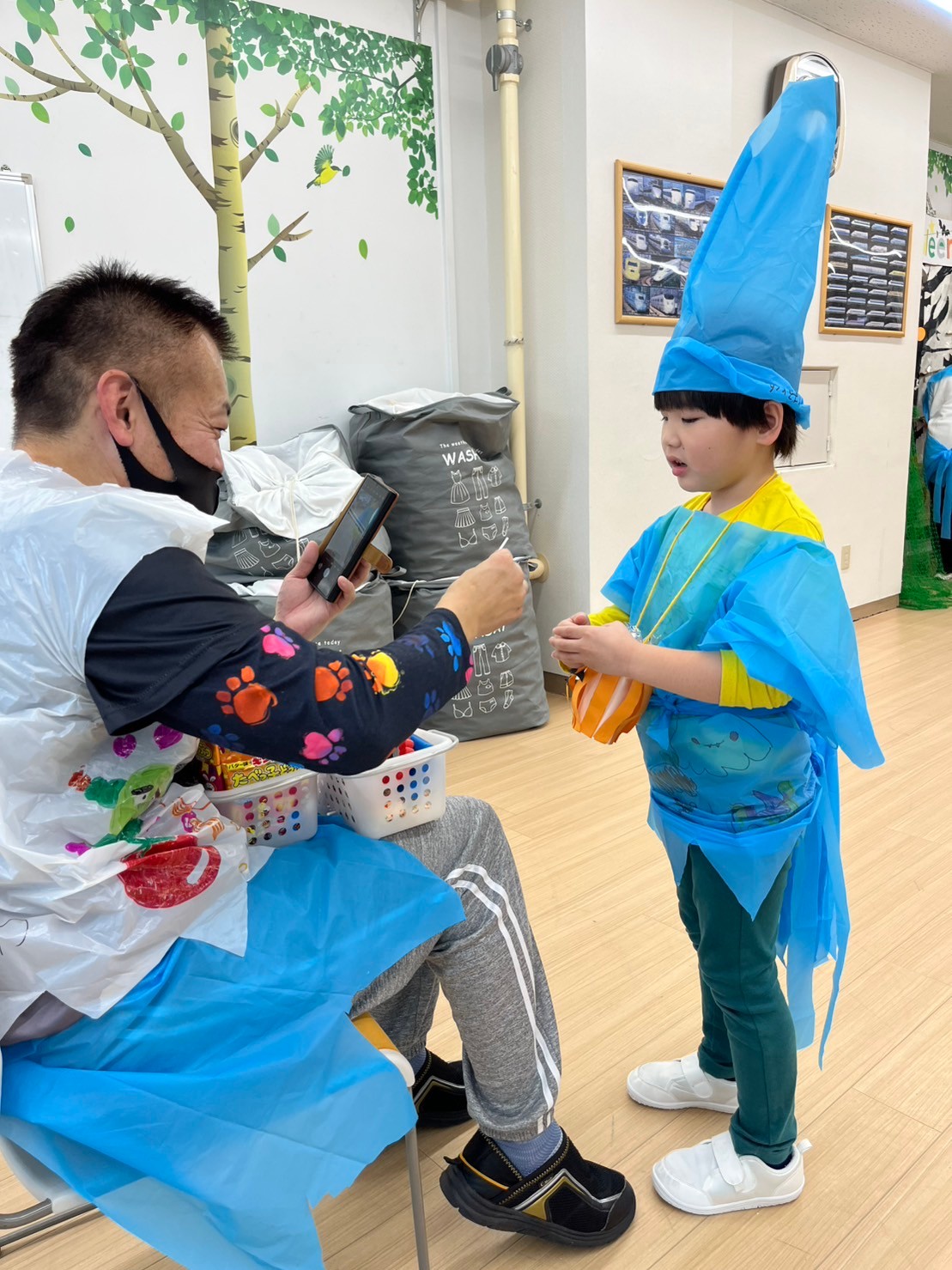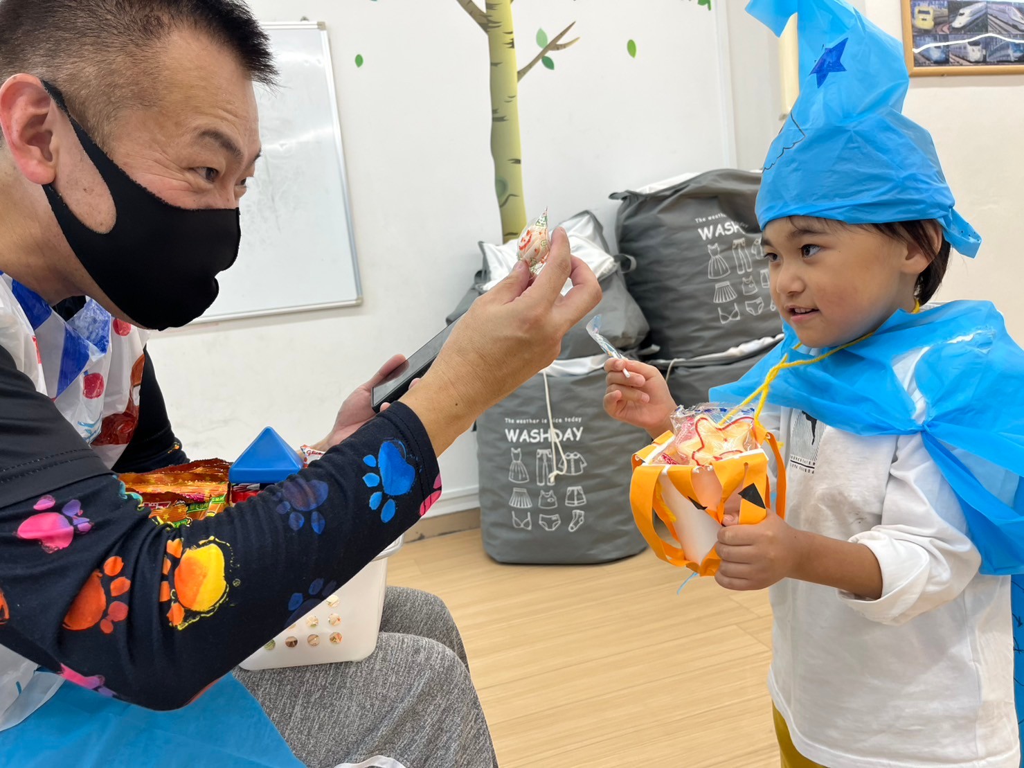 外国のお祭りであることを伝え、一人ひとりが認識できた子どもたちは、日本風にお菓子をもらうための魔法😀「トリック・オア・トリート❗」を一生懸命に奏でていました👏